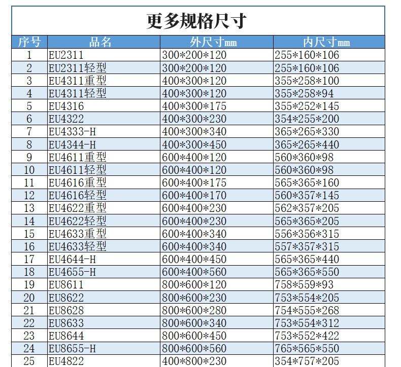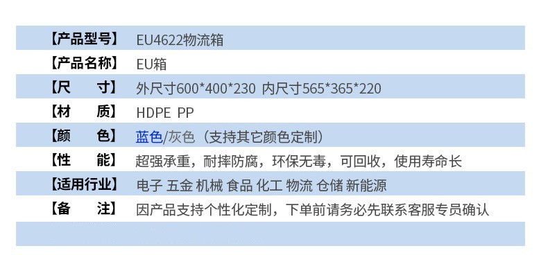 本店產(chǎn)品常規(guī)庫(kù)存為全新料藍(lán)色塑料托盤(pán),周轉(zhuǎn)箱,周轉(zhuǎn)籮,化工桶,中空板材及部分高性?xún)r(jià)比黑色一次性出貨產(chǎn)品。如需要其他顏色請(qǐng)聯(lián)系客服對(duì)接處理。因產(chǎn)品規(guī)格較多,未能全部上至店鋪,如店中沒(méi)有您需要的規(guī)格尺寸也請(qǐng)聯(lián)系客服。希望能解決您的問(wèn)題,我們竭誠(chéng)為您服務(wù)!!!